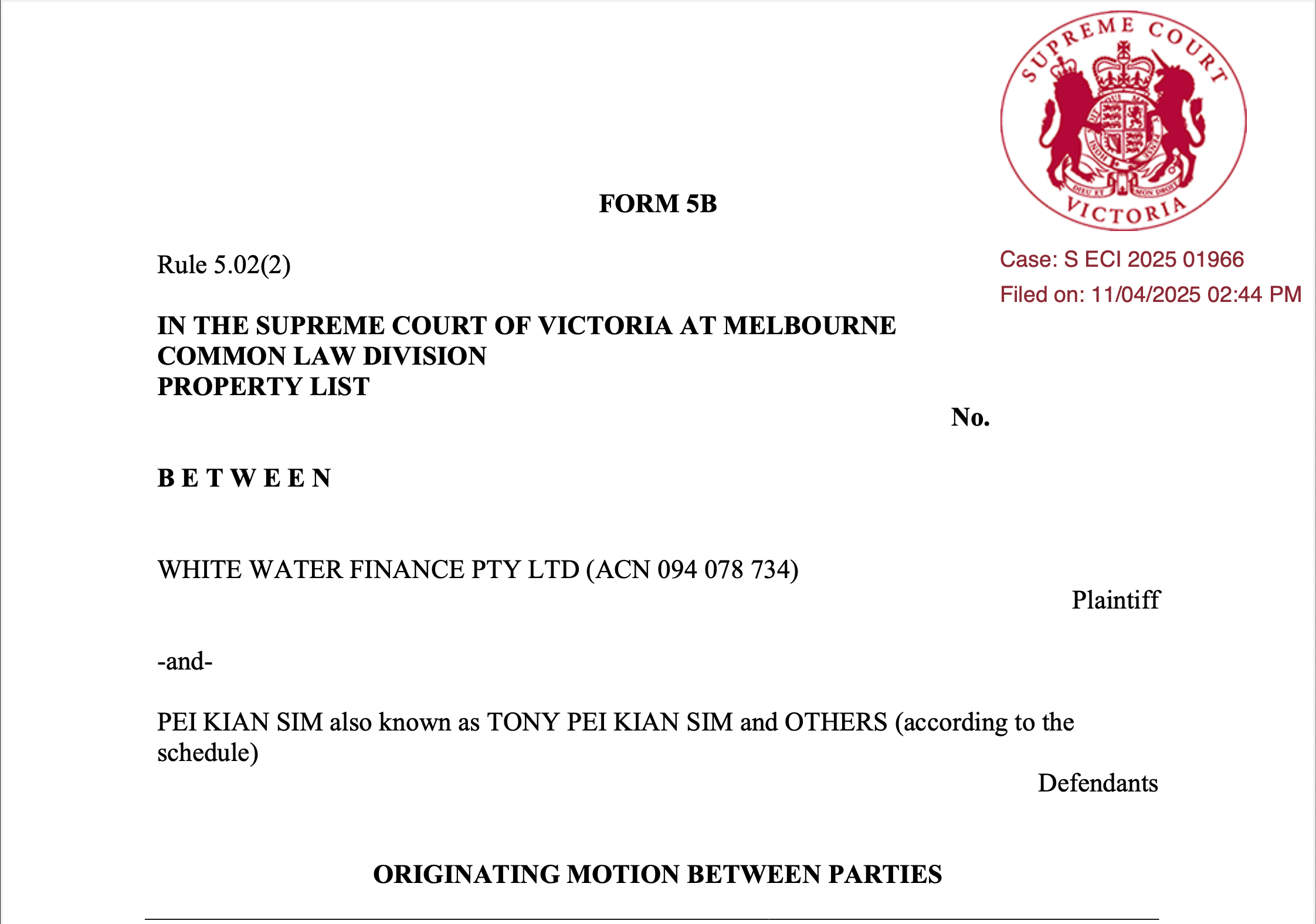 White Water's filed case says it relies on a 15 April 2010 loan agreement and a caveat lodged over Tony's Rye property on 7 May 2010.